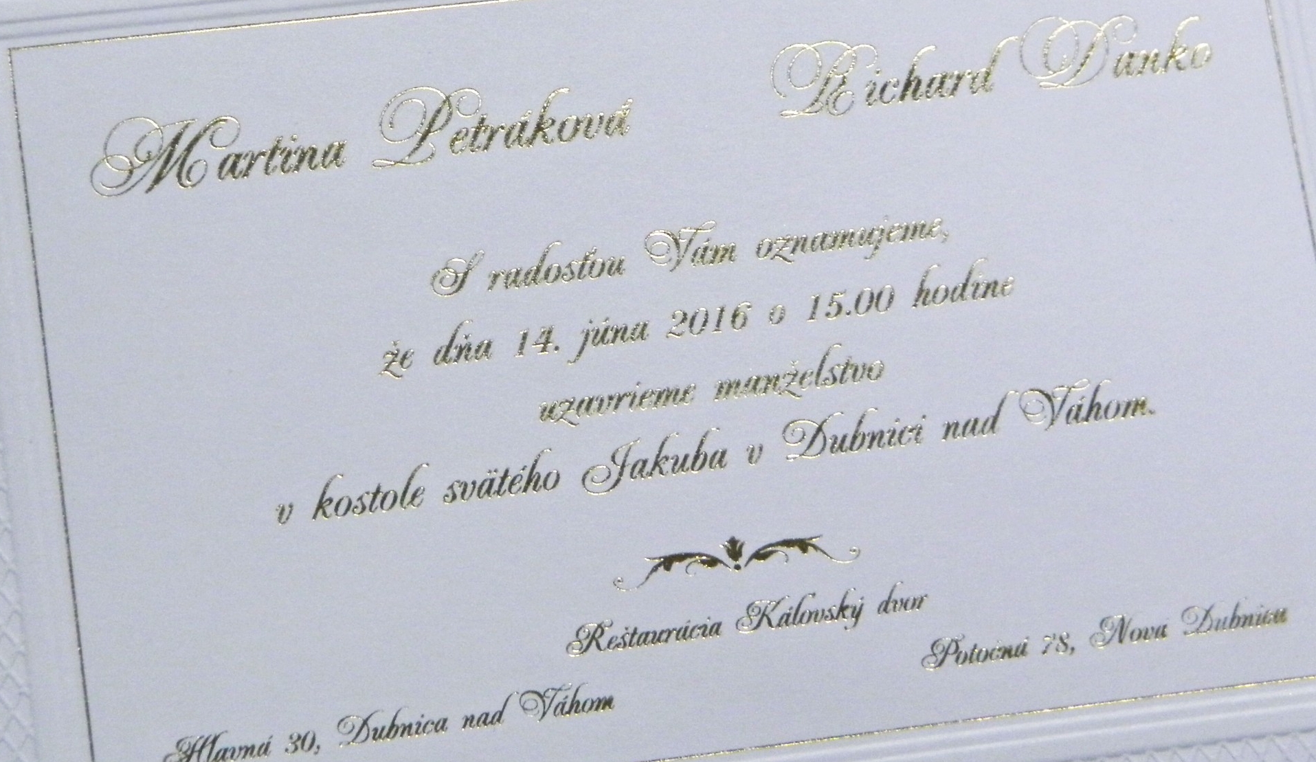Luxusné oznámenie z najnovšej kolekcie oznámení sa vynikajúcu cenu. Obal oznámenia v tvare obálky je vyrobený zo zlatistého metalického papiera. Po poskladaní v tvare obálky. V cene oznámenia je mosadzné pečatidlo s gravírovaním monogramov mladomanželov. Obálka se signuje pečatným voskom bronzovej farby. Po otvorení obalu je vo vnútri biela kartička s 3d ražbami rámčeka a texty sú tlačené zlatou fóliou.. Pozor akcia !!!! , pri zákazke nad 100 EUR je darčeková svadobná kazeta zdarma